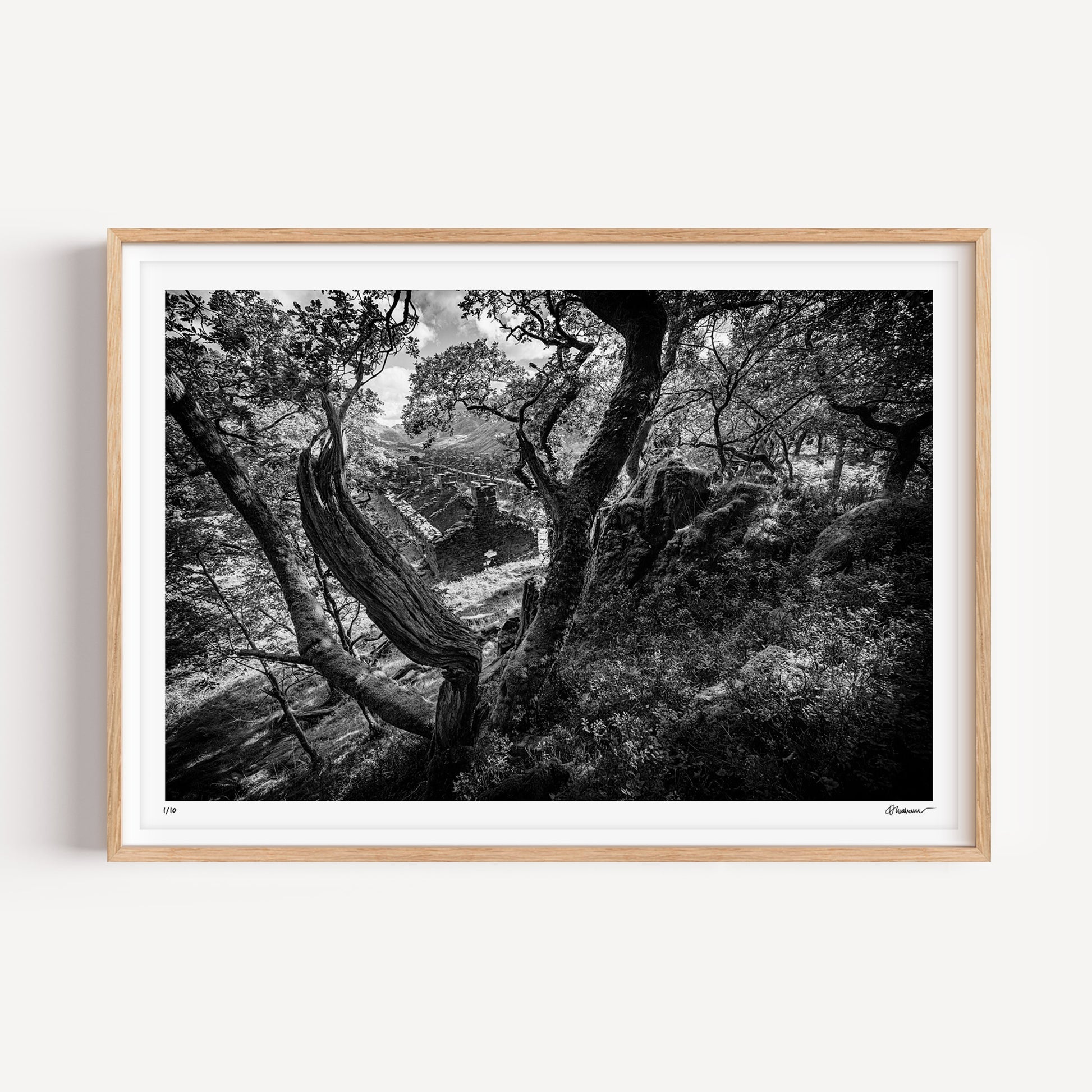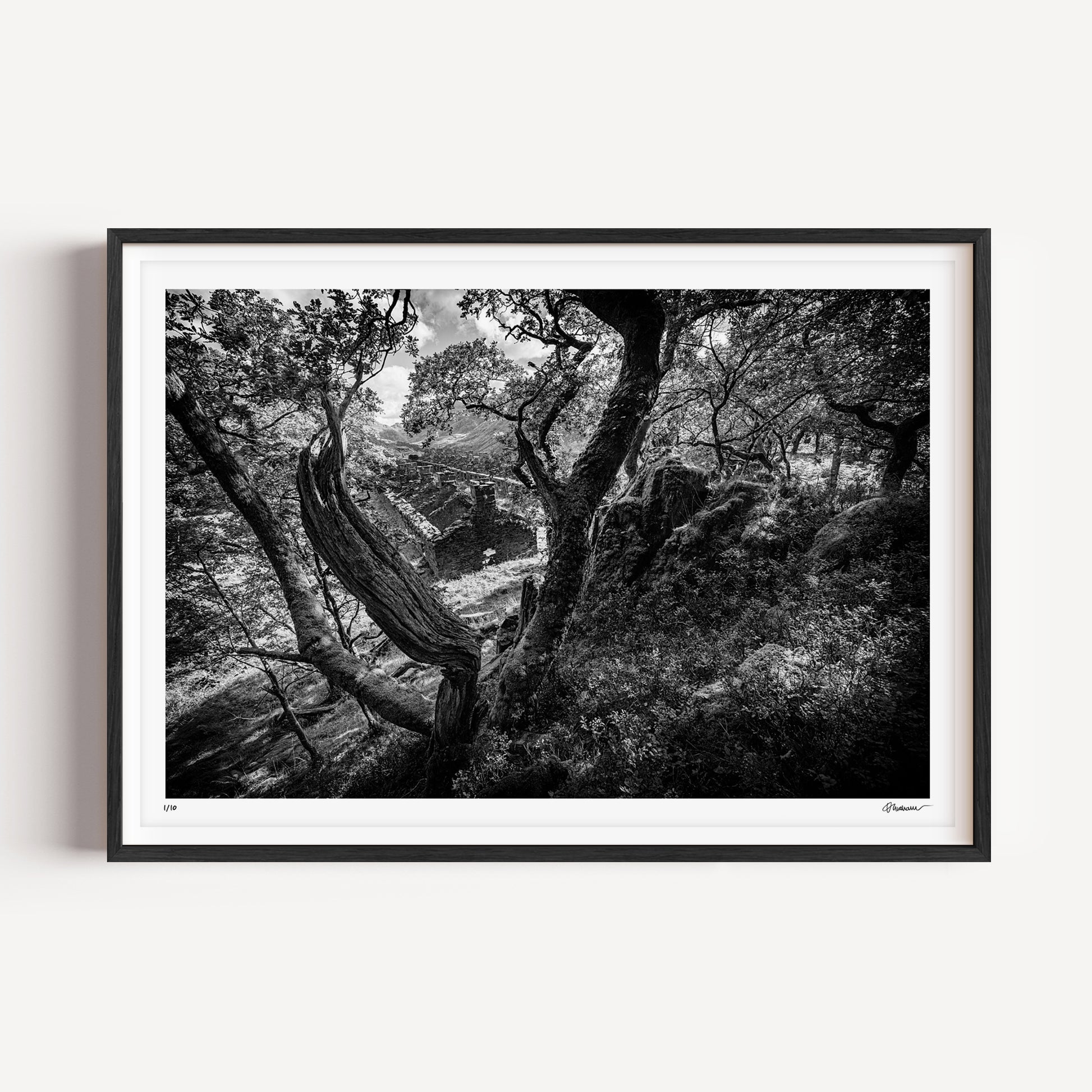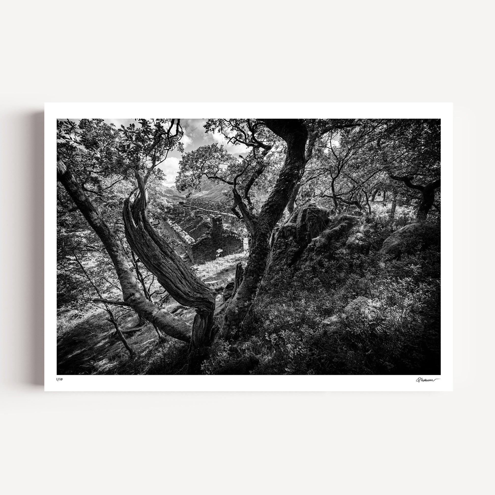 Limited edition fine art print of Anglesey Barracks at Dinorwic Quarry in North Wales. It's a bit of a steep climb up to this point but pretty amazing when you finally emerge from the woods at the top and stumble across the ruins. I took this image from back in the woods as I wanted to capture that feeling of discovery. I loved how the light was falling through the trees with a hint of the barracks beyond.